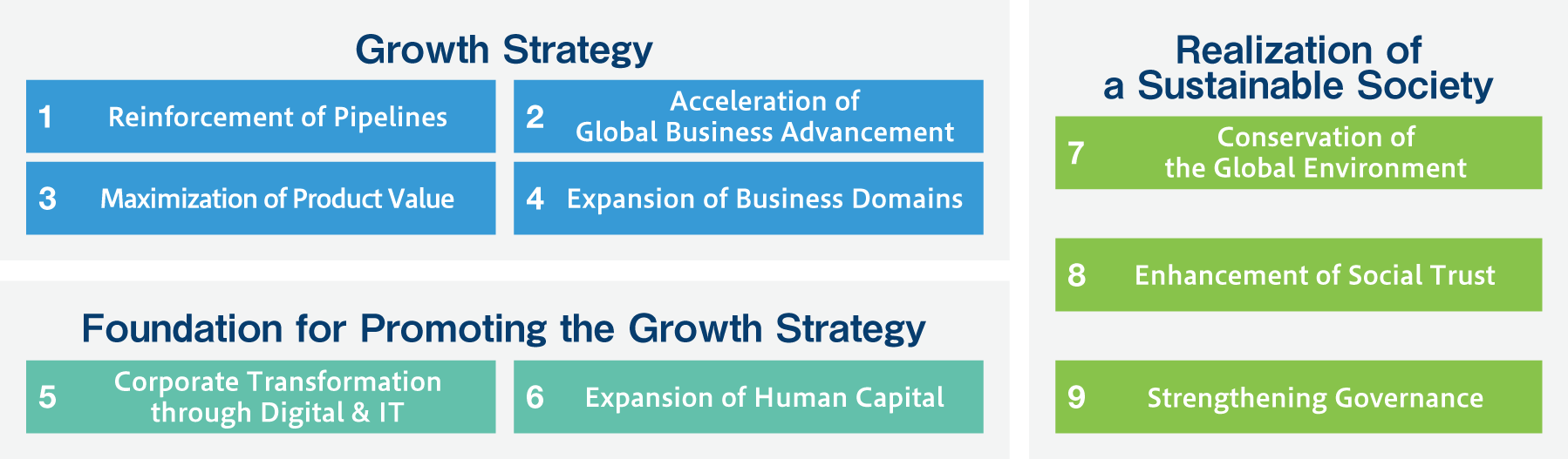 Since our foundation in 1717(Kyoho 2nd year of the Edo period), we have fully committed to the pharmaceutical business, under the corporate philosophy “Dedicated to the Fight against Disease and Pain”. In FY2021, we have newly established sustainable management policy, to realize a sustainable society.
