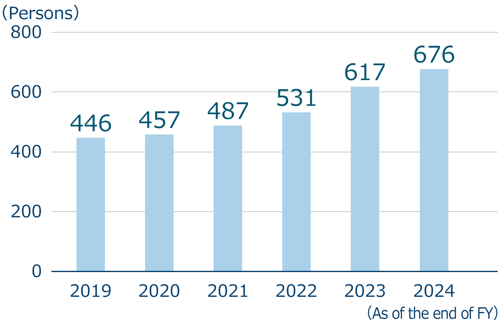 | Global talent | They are trained through the Global Skill Improvement Program (GSIP) or with planned dispatch overseas, etc. to acquire international perspective, cross-cultural communication, language skills, and other skills necessary to perform in a global business. For more information, please visit here. | 300 or more | 194 |