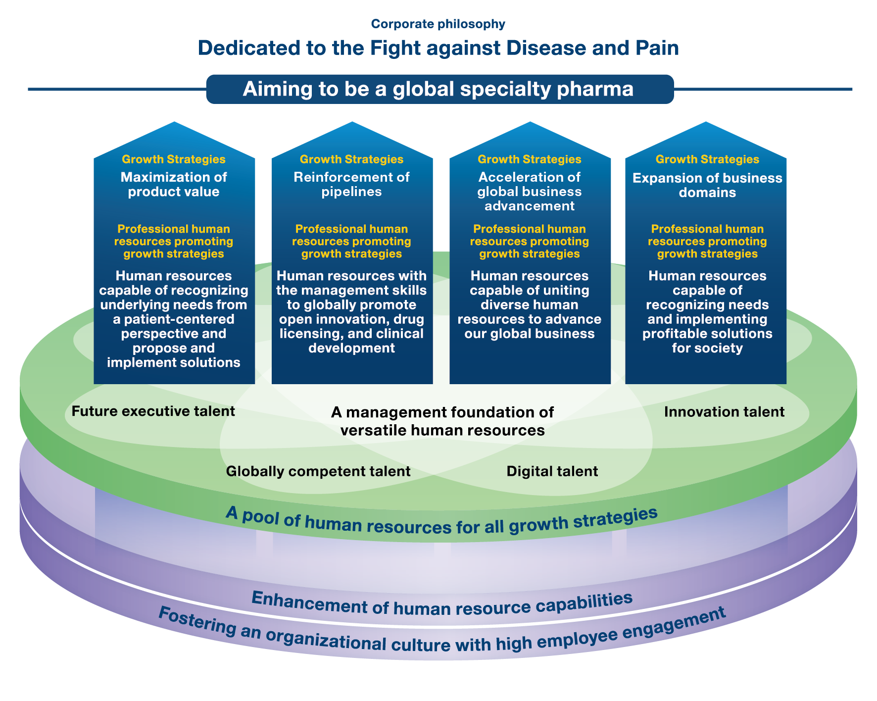 We have established four growth strategies to realize our corporate philosophy, "Dedicated to the Fight Against Disease and Pain," and are actively engaged in our business activities. It is our "talent" who implements these strategies and supports the sustainable development of the company. Therefore, we are promoting activities that consider the expansion of human capital to be one of our important business challenges, and report on the progress of these efforts regularly to the Board of Directors and other organizations.