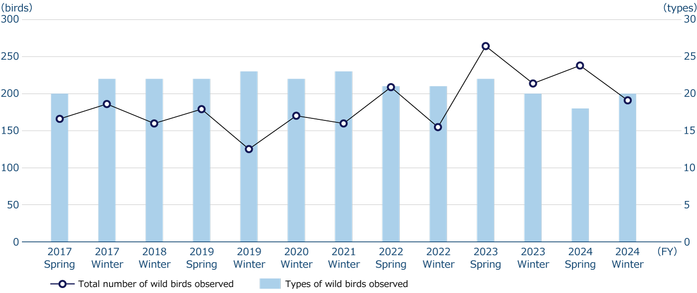 The Fujiyama Plant, one of our main plants, has a green space (36,000 m2) on its premises that is almost equivalent to the size of a baseball stadium. Since 2017, we have adopted conservation activities (community contribution activities) through wild bird surveys as an environmental goal based on our environmental management system (ISO14001). Every year, during the spring breeding and wintering seasons, we request the Wild Bird Society of Japan to conduct surveys* (up to four times a year) and use the results of those surveys as the basis for efforts to protect the abundance of biodiversity in the Fujiyama Plant (establishing green zones that are intentionally not mowed, planting trees that birds like, maintaining ponds and waterways, etc.). There has been no significant change in the species and total number of birds observed over an eight-year period, which can be interpreted to mean that ONO's production activities have not had a significant impact on nature. These results are also shared with Fujinomiya City and utilized in conservation activities related to biodiversity in local communities.