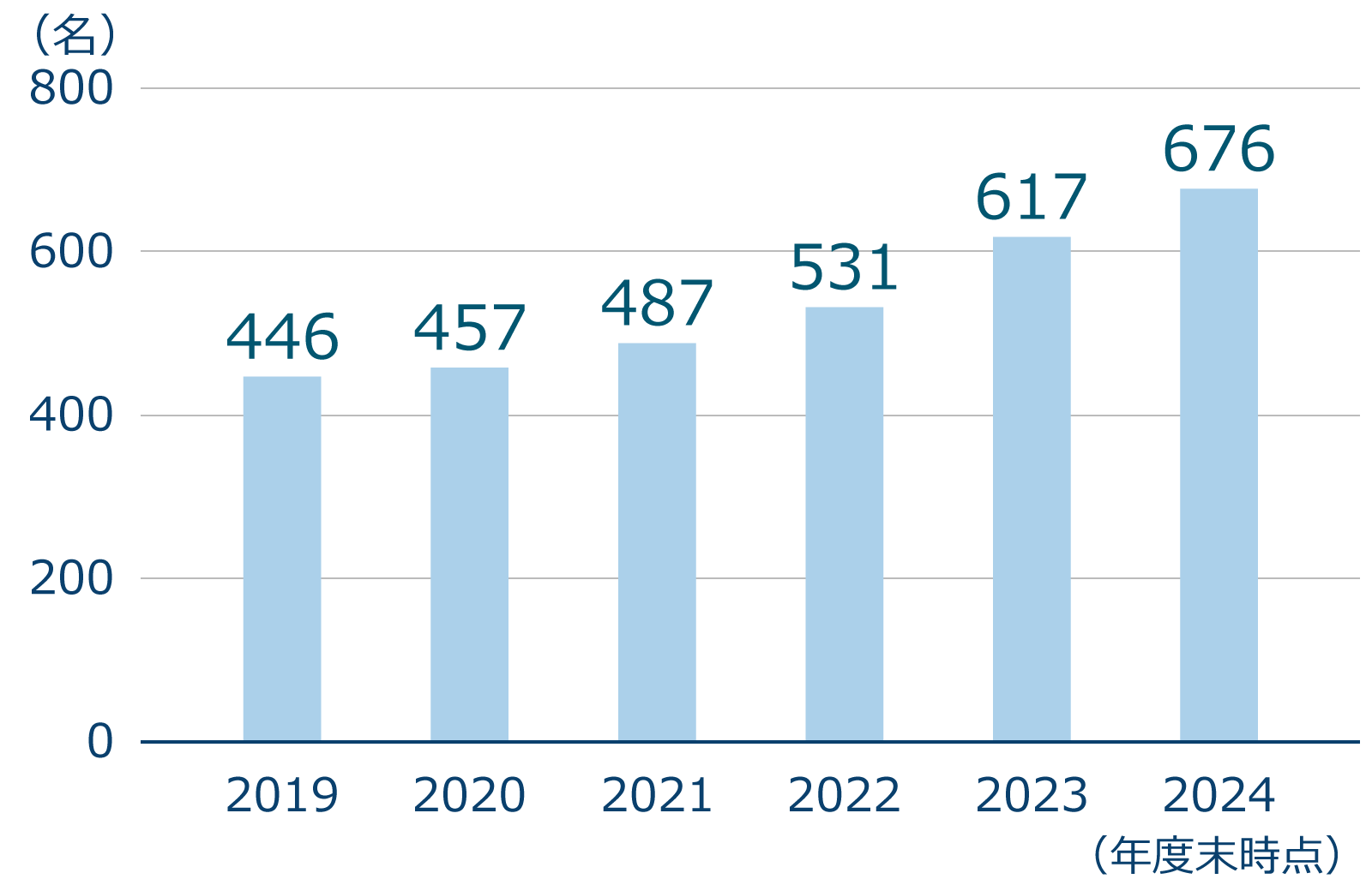 | デジタル人財 | デジタルテクノロジー本部以外のビジネスサイド(研究、開発、営業部門他)も含め、各事業のDX推進を通じてデジタルリテラシーの高い人財を育成する取り組みを行っています。詳細はこちらをご覧ください。 | 700人以上 | 872人 |