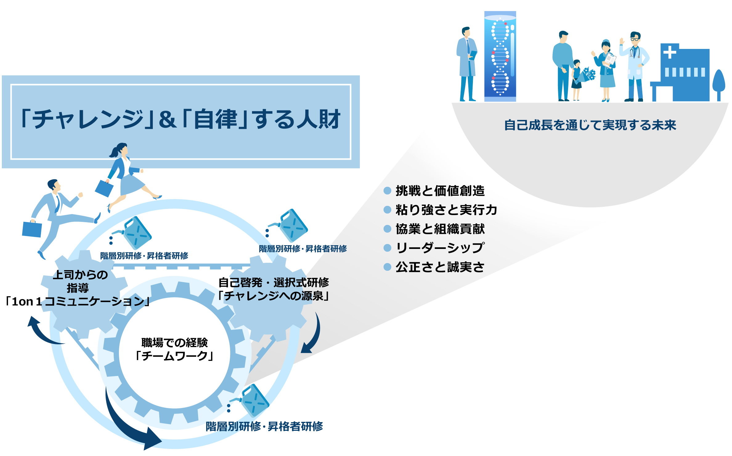 当社の求める人財は「チャレンジ」&「自律」する人財であり、人々の生命に深くかかわる医薬品に携わる製薬企業の一員として高い倫理観と強い責任感、使命感を持つとともに、グローバルスペシャリティファーマへの飛躍のための源泉となる人財の採用・育成を目指しています。
