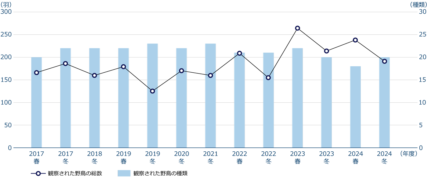当社主力工場であるフジヤマ工場では、敷地内に甲子園球場にほぼ匹敵する緑地(36千m2)を有しています。2017年から環境マネジメントシステム(ISO14001)に基づく環境目標として、野鳥調査を通じた保全活動(地域貢献活動)を採用しています。毎年、春の繁殖期と越冬期に、日本野鳥の会に調査*(年間最大4回)を依頼し、その結果をもとに生物多様性の豊かさを守る取り組み(意図的に草刈りをしない緑地帯の設定、野鳥が好む樹木の植樹、池や水路の整備など)を行っています。観察された野鳥の種類および総数については、8年間で大きな変化はなく、当社の生産活動が自然に大きな影響を与えていないことが読み取れます。本結果は富士宮市にも共有し、地域の生物多様性に関する保全活動に役立てています。