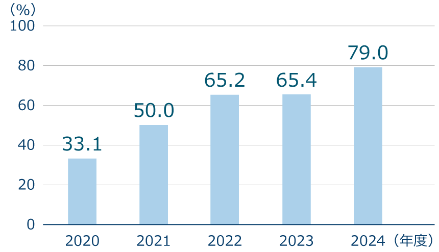 管理職の多様化については、特に若手・キャリア入社・女性の3つを柱に多様化を進めています。具体的には、2025年度より昇格における条件であった滞留年数を撤廃することで、年齢や社歴に関係なく実力のある人財の早期抜擢を可能とするとともに、育児休業などがキャリア形成の阻害要因にならないようにしています。また管理職のキャリア採用も積極的に実施しており、現在では管理職の22%、160名(2024年度)近くのキャリア採用の方が活躍しています。女性社員の活躍については、女性管理職比率が7.4%(2024年度)にとどまっており、当社の課題の一つとなっています。女性管理職比率を2026年度までに10%、2031年度までに20%という女性管理職比率目標の達成に向け、2024年度より、女性社員を対象とした研修(女性管理職候補に向けた成長のきっかけを作ることを目的とし、上司と一緒にストレッチアサインメントに取り組むとともに、社外講師からのコーチングを受ける研修)やメンター制度(本部長や統括部長等が女性社員のメンターとなり、女性管理職候補の視座を上げ、管理職へチャレンジすることを後押しする取り組み)を実施しています。他にも、部長級の管理職を対象に、アンコンシャスバイアスをコントロールし、マネジメントに活かす方法を学ぶ研修を実施しました。今後も 目標達成に向けて、年齢・社歴・性別に関わらず公平に人財を採用・育成・確保できる仕組み・環境を整備していきます。