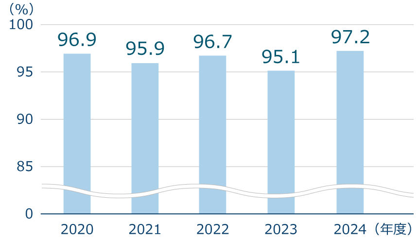 「管理職の多様化」および「個の経験と視点の多様化」を進める上で、働き方の多様化をはじめ、継続的に働きやすい労働環境へ整備していくことが重要と考えています。当社では、優秀な人財の採用・確保に資する働き方改革を進め、ワークライフバランスの向上に継続的に取り組んでいます。業務効率化としてDX推進、ITを活用したシステムの改善、魅力的な労働環境づくりとしてコアタイムを撤廃したスーパーフレックスタイム制度や在宅勤務制度、勤務間インターバル制度などの導入も進めてきました。2024年度は、勤続年数に関わらず年次有給休暇の付与日数を拡大(一律20日)、ドレスコードをオフィスカジュアルに改定しました。また、毎週金曜日にオフィスカジュアルよりさらにカジュアルな服装(ジーンズ等)での勤務を認める「カジュアルフライデー」を導入し、より柔軟で働きやすい環境整備を推進し、メリハリのある働き方を実現することを目指しています。働き方の多様化の取り組みを通じて、魅力ある労働環境を整備し、採用競争力の強化・優秀な人財確保につなげていきます。
